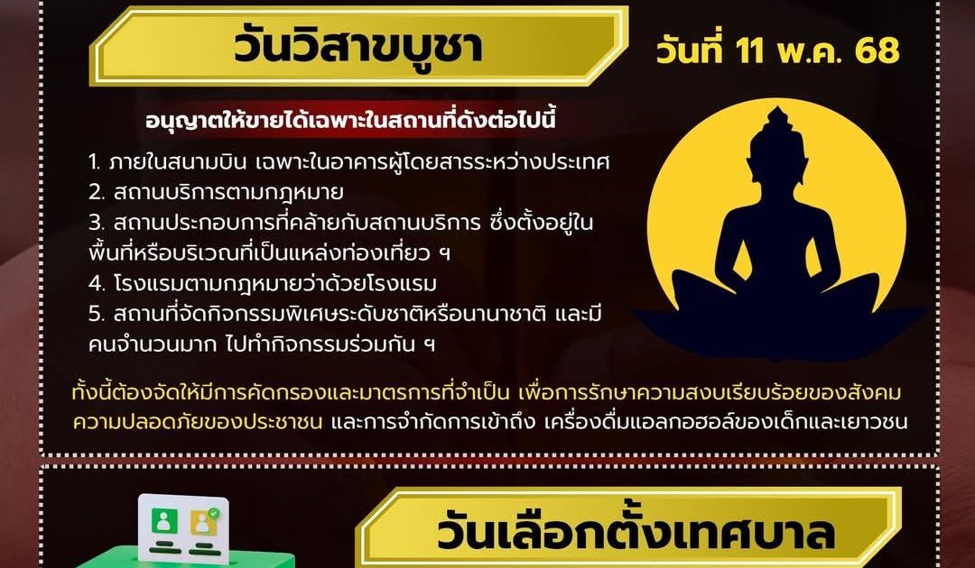 งดจำหน่ายสุราทั่วประเทศ ตลอดวันที่ 11 พฤษภาคม 2568