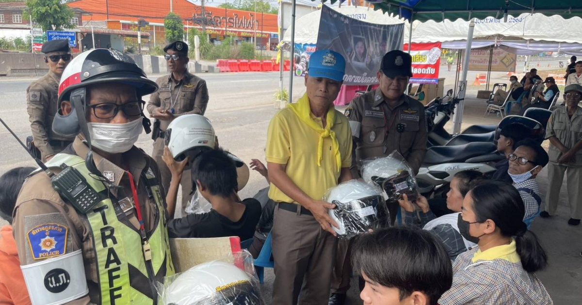 พร้อมชุดจราจร ได้ตั้งจุดตรวจ กวดขันวินัยจราจร ที่หน้าศูนย์บริการประชาชน ตลาดกกค้อ พร้อมแจกหมวกนิรภัย