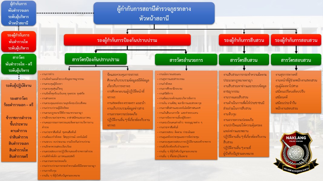 1.งานอำนวยการ มีหน้าที่เกี่ยวกับการอำนวยการ การวางแผน การตรวจสอบติดตามและประเมินผลงาน ที่เกี่ยวกับนโยบาย ยุทธศาสตร์ และแผนงานของสถานีตำรวจ งานการบริหารบุคลากร งานจเรตำรวจ งานกิจการพิเศษ งานความมั่นคง การศึกษา การฝึกอบรม งานวิชาการ สวัสดิการ การพัฒนา การบริหาร จัดการ งบประมาณ การเงิน การพัสดุ การพลาธิการและสรรพาวุธ การส่งกำลังบำรุง รวมทั้งลักษณะงานอื่น ๆ ที่เกี่ยวข้องหรือเป็นส่วนประกอบของงานดังกล่าว เพื่อส่งเสริมหรือสนับสนุนการปฏิบัติงานของสถานีตำรวจ
